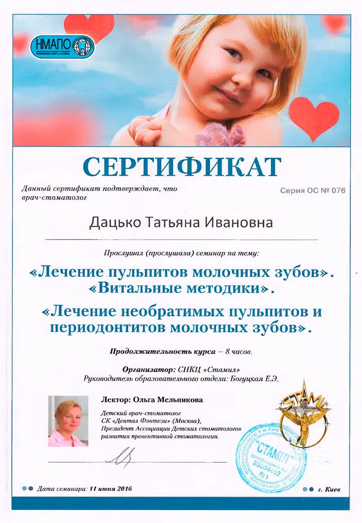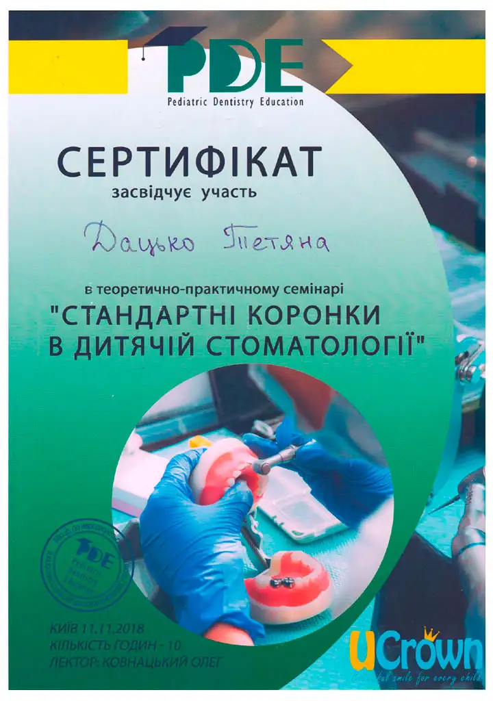 Володіє методиками естетичної реставрації дитячих зубів, протезування металевими і цільнокерамічними коронками молочних зубів, проводить лікування дітей під седацією.